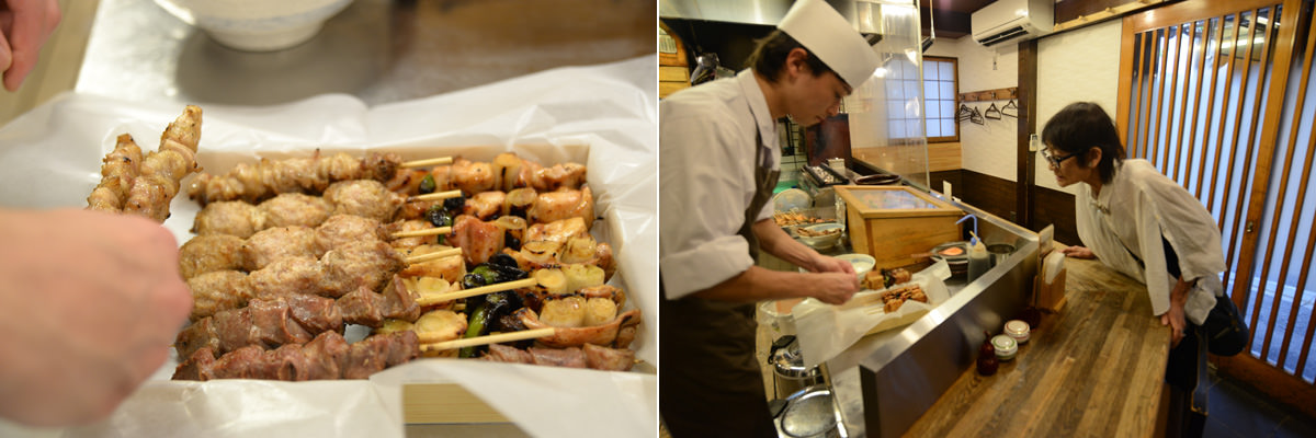 写真左:手みやげ用には、店で焼いた焼き鳥をその場で詰めてくれる。