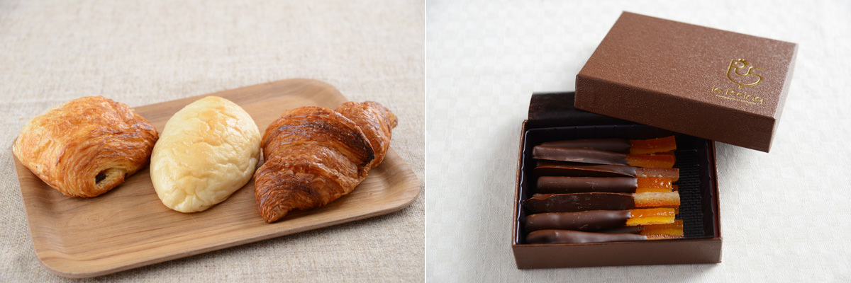 写真右:ちょっとした手みやげとして使えるチョコレート オランジェット(小箱)1004円。オレンジピールとチョコレートの粋なマリアージュがたまらない。
