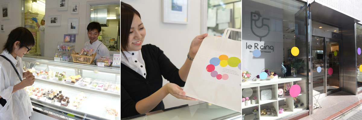 写真左:店内で、手みやげ用のケーキを選ぶ森脇さん。とても楽しそうです。 写真中:ショップの紙袋もカラフルでかわいらしい。