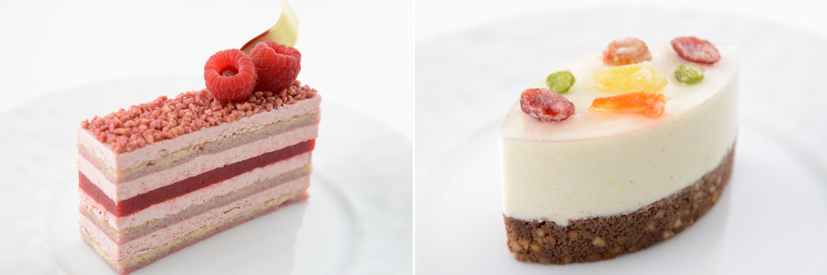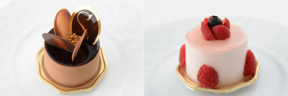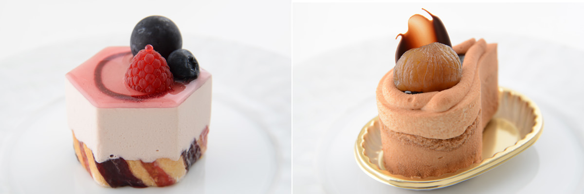 写真左:穏やかな風味に仕立てられた「フランボワジエ」680円。 写真右:ひかえめに香る洋梨とまろやかな栗のムース「ポワリエ」680円。