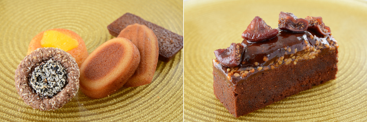写真左:右より時計回りに、「フィナンシェ キャフェ」300円、「マドレーヌ アルディショワ」330円、「フィナンシェミエル」300円、「ショコラプリュエンヌ」350円、「ココアナナス」350円。 写真右:「キャラメル フィグ」1950円。