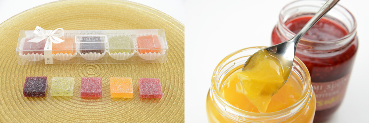 写真左:フルーツゼリー「パート・ド・フリュイ」1850円。内容は左より、カシス、キウイ、赤すぐり、パッションフルーツ、フランボワーズ&ライチ。