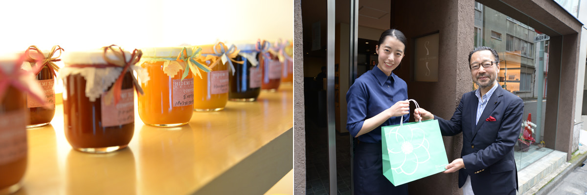 写真左:色鮮やかで豊富な種類のジャム。 写真右:「イデミ スギノ」スタッフの三嶋なぎ沙さんと宮下裕史さん。