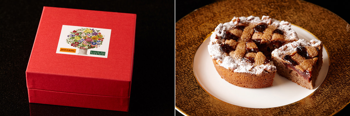 写真:「リンツァートルテ」1900円。エッセイストであり画家でもある玉村豊男さんの長野県東御市の「ヴィラデスト ガーデンファーム アンド ワイナリー」のリュバーブのジャムとクルミを使用。箱に描かれている絵は、玉村さんによるもの。