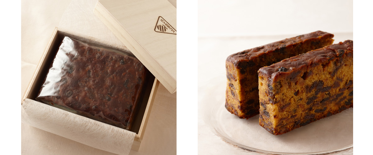 写真:「自家製プレミアムフルーツケーキ」。小サイズは大きさ約11.5×16×6cm、重さ約1kgで5400円。約2倍の大サイズ10800円もある。通販可。