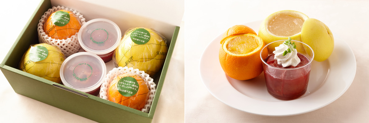 くり抜きゼリーは、オレンジとグレープフルーツの中をくり抜き、しぼりたての果汁を余さず使用。「蓋になっている部分には、あえて少し果肉を残しています。食べるときに絞っていただくと、よりフレッシュ感がアップします」と中村さん。