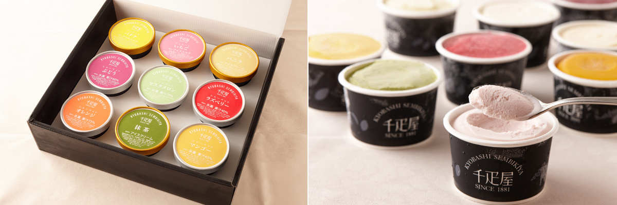 写真:「アイスクリーム&シャーベット」。アイスクリーム4個(バニラ、抹茶、バナナ、苺)とシャーベット5個(メロン、オレンジ、マンゴー、ラズベリー、ぶどう)が入って4752円。他にも個数違いや組み合わせ違いのセット各種あり。通販可。