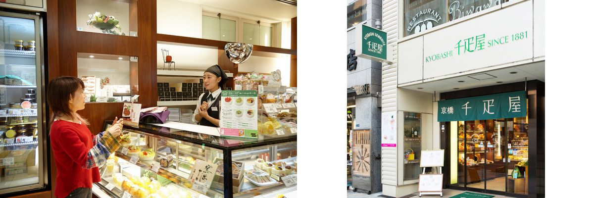 写真左:店頭で手土産を選ぶ永浜さん。 写真右:京橋千疋屋 京橋本店外観(写真撮影=野田真)