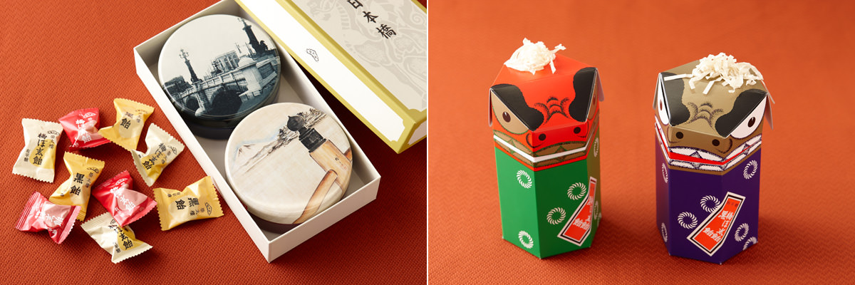 写真左:梅ぼ志飴と黒飴の詰め合わせ“名橋日本橋缶”(2缶入)1296円。榮太樓總本鋪が所蔵する明治44年の「日本橋開通記念絵はがき」と、初代歌川広重の「日本橋より富嶽遠望図」がデザインされた缶は、日本橋のおみやげに最適。