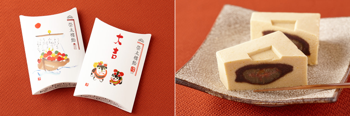 写真右:渋皮栗をとろけるしぐれの黄味餡と風味豊かな小豆餡で包んだ、日本橋本店限定品の「楼(たかどの)」は、お年賀にぴったり。2個入り1750円。