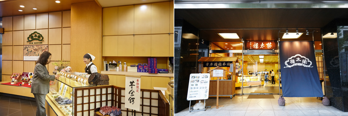 写真右:江戸情緒が感じられる、ゆったりした店内。併設の喫茶室では、日本茶や抹茶などが楽しめる。