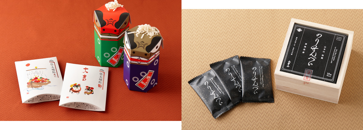 写真左:お年賀用の「榮太樓飴 江戸初春」。左は宝船(黒飴9粒入)、右は干支(梅ぼ志飴9粒入)の2個入りで713円。