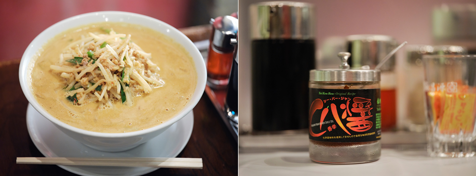 左)ジャンボ餃子の次に、店内で人気の「担々麺」税込957円。ゴマをたっぷり使ったクリーミーな汁が、細麺によく絡む