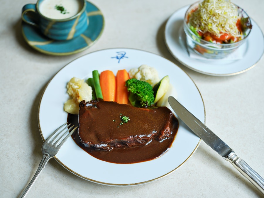 タンシチュー(単品・税込2,200円)もファンが多いメニューの一つ。牛タンを塊のまま4時間半煮込むため、やわらかく食べごたえがある。ランチタイムのスープ、サラダ、ライスのセットは税込750円。玉ねぎ、ベーコン、エビの入ったチャウダーは、創業当時には牛乳しか使っていなかったが、生クリームを加えてコクをプラスした