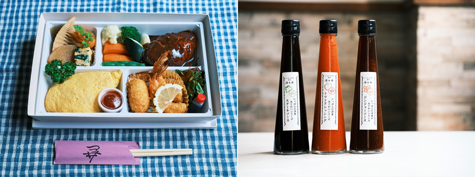 右)自家製ソース「にっぽんの洋食 あじわいシリーズ」も販売。創業の味を伝えるトマトケチャップと玉ねぎのドレッシング、店の味を再現できるポークジンジャーのソース、ステーキソースの3本があり、セットで税込3,500円(店頭受取価格)。予約が入ってからつくるため、前日までの要予約。ネット通販も可