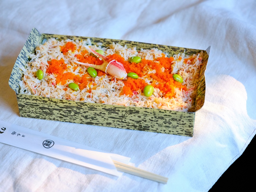 蓋を開けると、お店と寸分変わらぬ色あざやかなかにめしが目に飛び込んでくる。お店で食べる温かいお膳がおいしいのはもちろんだが、冷めてしっとりしたおみやのかにめしならではの味わいがある。味がごはん全体になじみ、かにの甘みがよりダイレクトに響いてくるのだ。