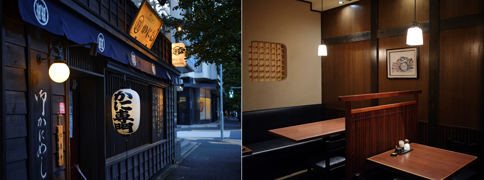 その西河岸のお地蔵さんの並びに、夕方になるとぼうっとやわらかな提灯の明かりを放つ店がある。黒褐色の板壁と格子戸、提灯には「かに専門」「つめ酒」の筆文字。下戸の私でさえ吸い寄せられそうになる店構えなのだから、呑んべえならばいわんや、に違いない。