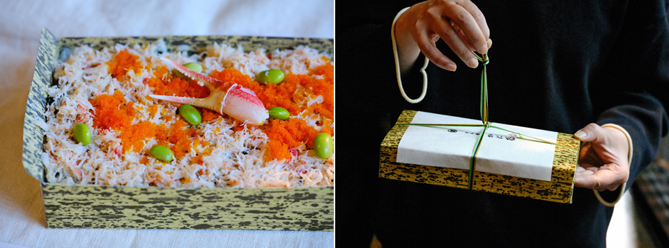 かにの甘み、風味を殺さないように気をつけながら、かにのうまみを引き出す。そのために、かにとごはんは、別々のだしで炊く。加えて、教えてもらうまで私は気づかなかったのだが、薄く煮たかんぴょうとしいたけ、それにガリが味つけ程度に薄く、細かく切って混ぜ込まれているという。