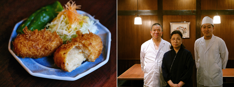 左)お店のもう一つの名物は、熱々の「かにクリームコロッケ」税込1518円(持ち帰りも可)。ランチの御かにめしについてくるミニかにクリームコロッケは、追加料金で通常サイズに変更もできる