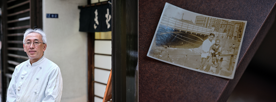右)店に残る古い写真。右の男の子が芳幸さんの父・芳雄さんで、後ろには埋め立てられる前の京橋川が写っている