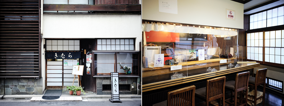 きむらの外観(左)と内観(右)。リニューアル時に、二代目の友人だったデザイナーがファサードや内装を手がけた。木桟や障子の直線と赤と黒をのデコラの天袋が、落ち着いた雰囲気ながらも古臭くなりすぎない印象に