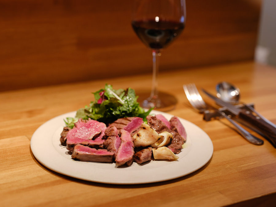 内臓は流通量が少なく、決まった店以外にはなかなかまわってこない。店を始めたばかりの藤岡さんは、品川の食肉市場に毎日通い詰め、徐々に質のよいものを仕入れられるようになった。それだけに、内臓のグリルの仕上げはシンプルに塩、コショウだけ。臭みがまったくないのはもちろんのこと、これほどまで部位ごとに食感の違いや味わいの豊かさがあったのか、という新鮮な驚きがある一皿だ。