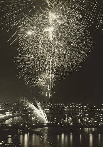 両国の川開き(撮影・昭和32年、柳橋大次郎)。江戸時代から名物とされ、陰暦5月28日には隅田川で花火が打ち上げられ、玉屋・鍵屋が互いに技を競い合い、岸も水上も見物客で大いににぎわった。