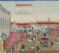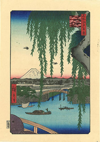 「名所江戸百景 八つ見のはし」(歌川広重画)。手前の一石橋の前に、左右に今は埋め立てられた外濠が流れている。奥には、こちらも埋め立てられた道三堀に、銭瓶橋が架かる。