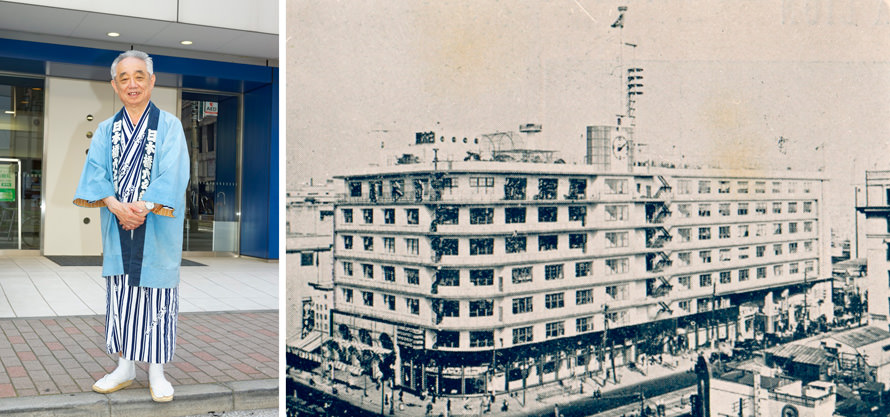 (左)府川利幸さん。由緒ある山王祭にて。(撮影・大八木宏武) (右)白木屋(以下図版すべて所蔵・中央区立京橋図書館)