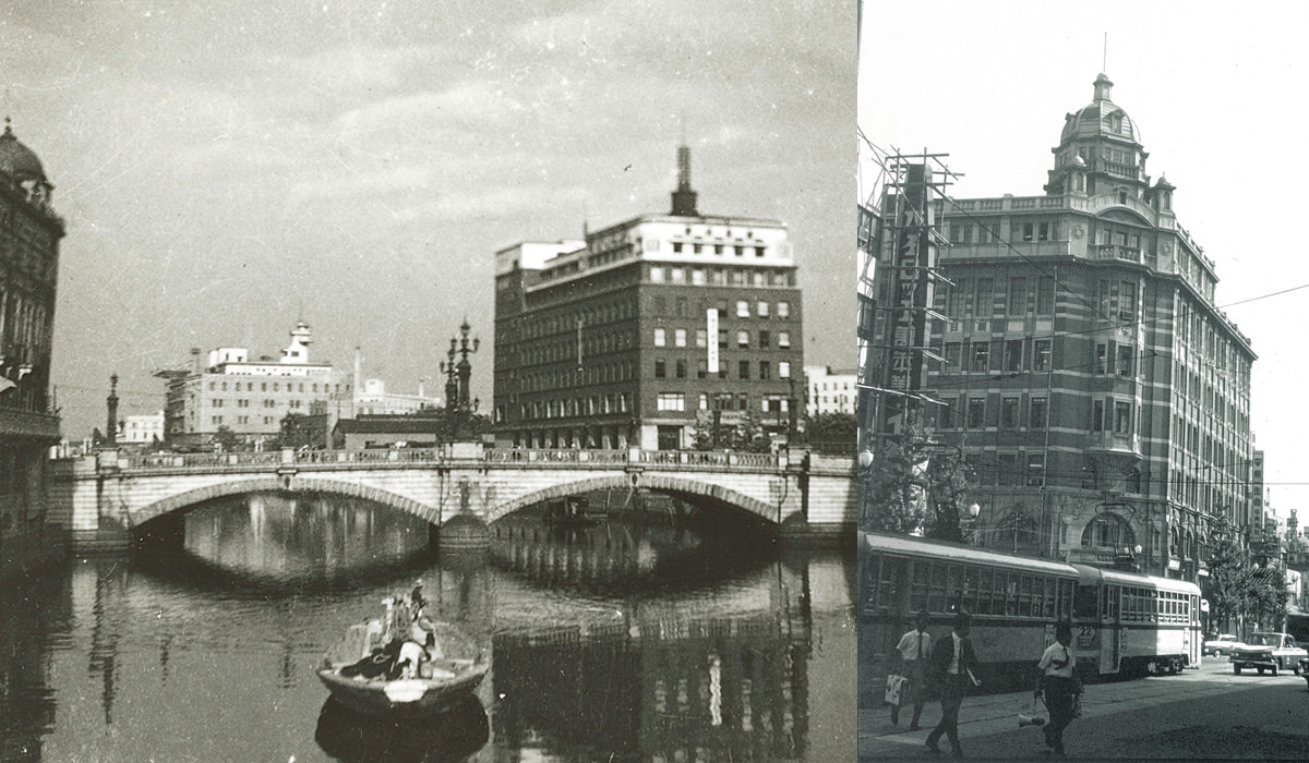 左:昭和14年頃の日本橋。船の往来も多く、橋の美しさも際立つ。提供 中央区立京橋図書館