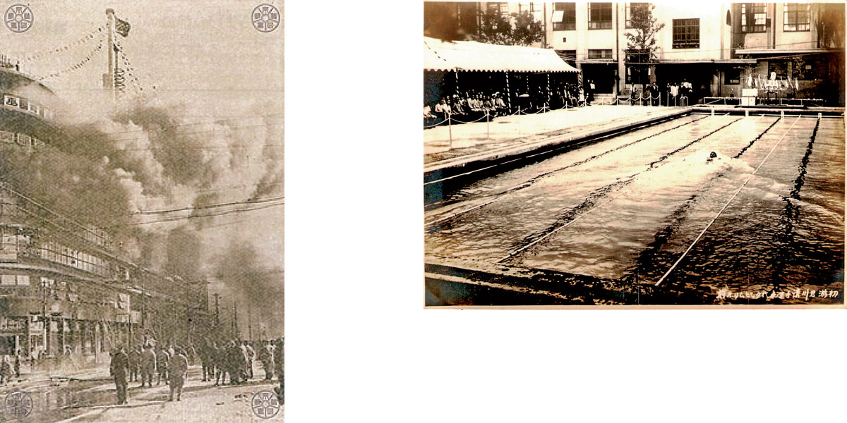 右:京橋昭和小学校(現中央区立城東小学校)にプールが敷設された落成式の様子(昭和5年)。地元の旦那衆が寄贈した。提供 西野文人