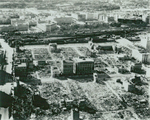 第二次世界大戦の空襲で被害を受けた、現八重洲二丁目および京橋一、二丁目あたりの様子。右上が東京駅八重洲口と八重洲橋(『東京建物百年史』より転載)