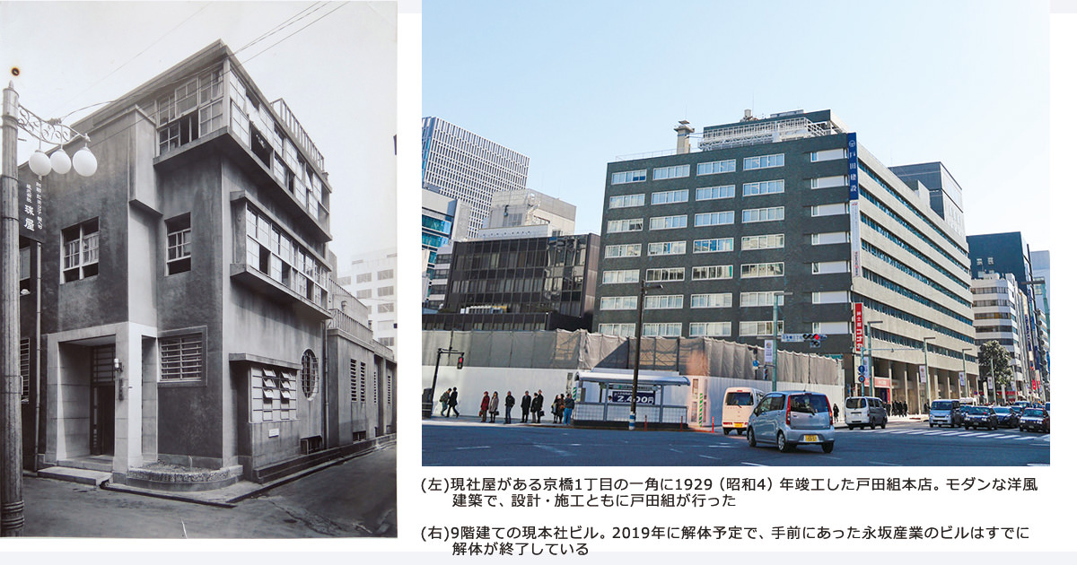 京都に生まれ、宮大工の修業を積んだ創業者の初代戸田利兵衛は、明治14(1881)年に上京。赤坂で「戸田方」として建築請負業を開始した。一時東京を離れるが、31(1898)年に再上京して事務所兼住居を構えたのが、現本社ビルのすぐそばの京橋区