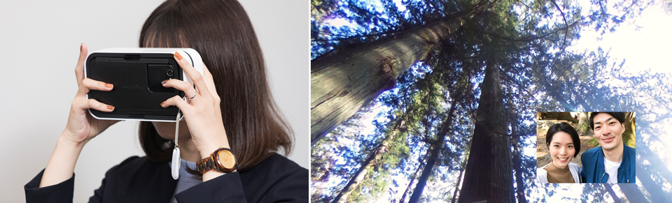 左)セットしたスマートフォンで受信した写真が、VR同行者のVRゴーグルに投影されるしくみになっている