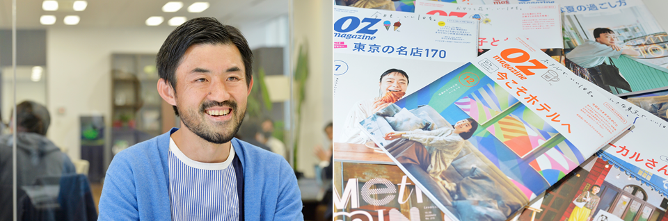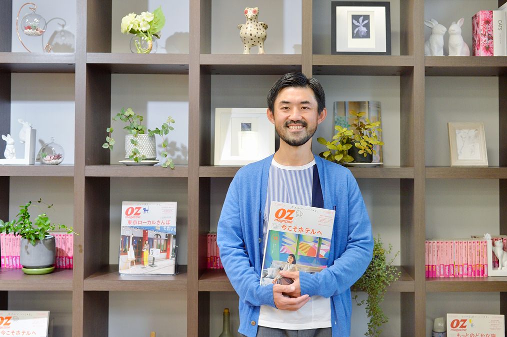 スターツ出版 オズマガジン編集長・井上大烈さん。編集部は京橋にある。「場所柄、よく特集する銀座や日本橋の変化をダイレクトに感じられます。また清澄白河や蔵前、谷根千など最近盛り上がっている東東京エリアに、自転車でサッと行けるところもいいですね」