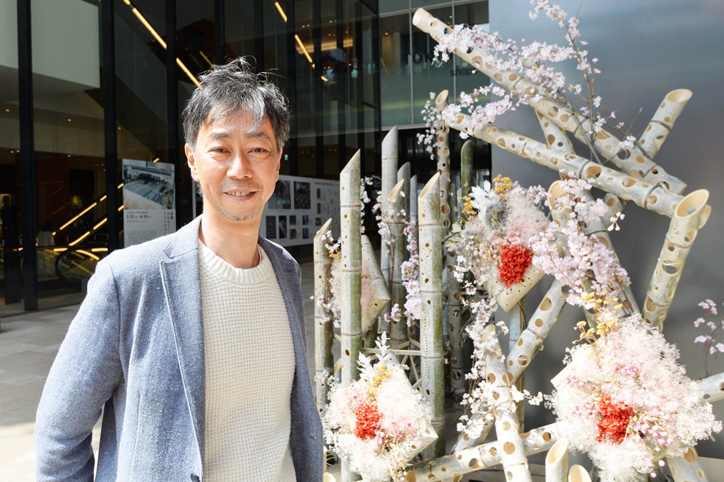 「竹あかりとは、竹にさまざまな模様をくり抜き、中にあかりを灯す装飾です。その演出制作・プロデュースを行うCHIKAKENというユニットと、我が社がパートナーシップを取って活動して8年ほどになります。イベントのお声がけがあり、ぴったりなのではと提案させていただきました。竹あかりの華やかさ、優雅さがイベントに合うのはもちろん、京橋には江戸時代に竹材の市場である竹河岸があったんです。こういった歴史的な背景からも、いつかこの地で竹あかりをやってみたいという思いが、心のどこかにありました。今回は、季節に合わせて、CHIKAKENが制作した竹に、花門フラワーゲートが桜を装飾。花できれいなラインを作ることはとても難しかったのですが、CHIKAKENとも相談し、デザインのブラッシュアップをしながら進めました。花がよく見える昼間、花もライトも映える夕方17時ぐらい、明かりがメインの夜と、1日のうちでも時間帯によって見え方が変わるのも見どころで、多くの方に楽しんでいただけたのではないかなと思います」