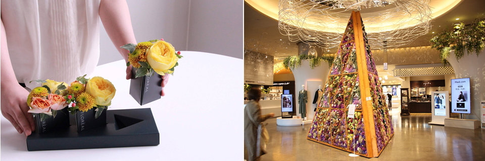 左)花門フラワーゲートが展開する高級フラワーショップ「FLOREAL」で採用されたLIMEX製品の紙箱