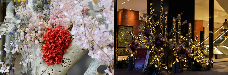 右)マルイ・モディ各店を彩った、同社のドライフラワーオブジェ