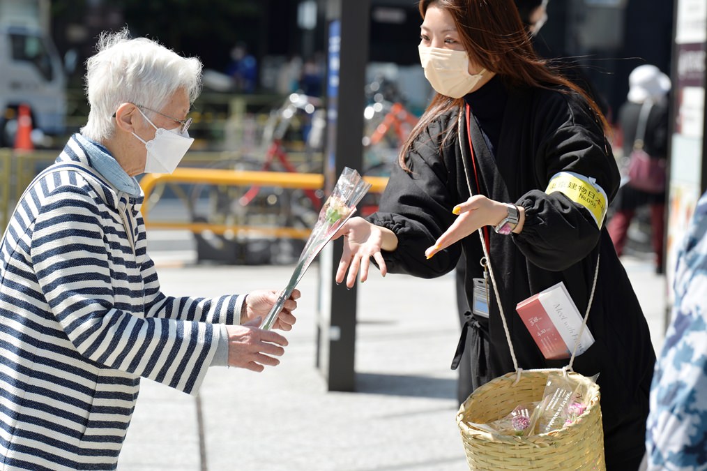 花の無料配布の様子。受け取った人から『わぁ!』と喜びの声が上がる一幕も