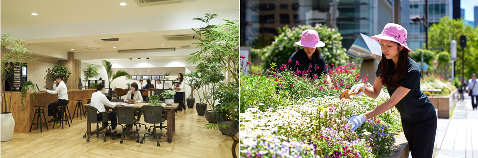 左)集中しやすく、適度に開放的になれるオフィスに今や欠かせないグリーンの存在