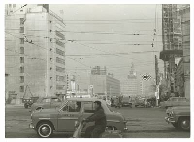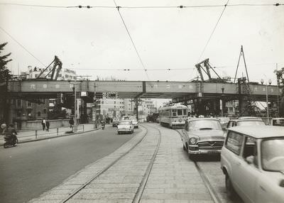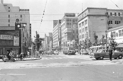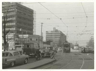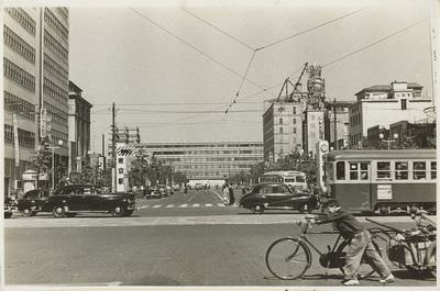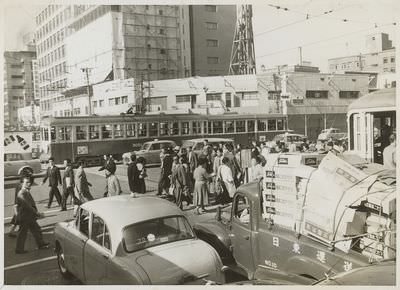 (6)「日本橋白木屋前の都電交叉点」(昭和32年)