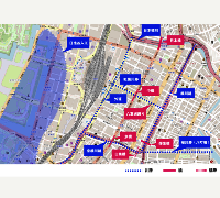 舟運、陸運の便から、日本橋のまわりには河岸が集まり、往来でごった返した。よく知られているのは、江戸橋までの北岸にあった魚河岸だ。その対岸には、塩漬けや干物を扱う四日市河岸。なお江戸橋は、かつては今よりもやや下流にあり、ちょうど日本橋川が「へ」の字に曲がるあたりに架かっていた。関東大震災の復興事業で昭和通りができるのにあわせ、現在の位置に移動したという経緯がある。