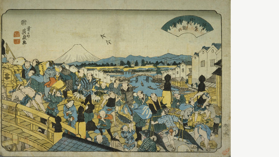 弘化頃(1843〜1846)制作とされる渓斎英泉『江戸八景 日本橋の晴嵐』。日本橋の魚河岸から仕入れたばかりの魚を売り歩く棒手振り(ぼてふり。天秤棒を担いで物を売り歩く行商人)や旅人などでにぎわう(提供・国立国会図書館デジタルコレクション)