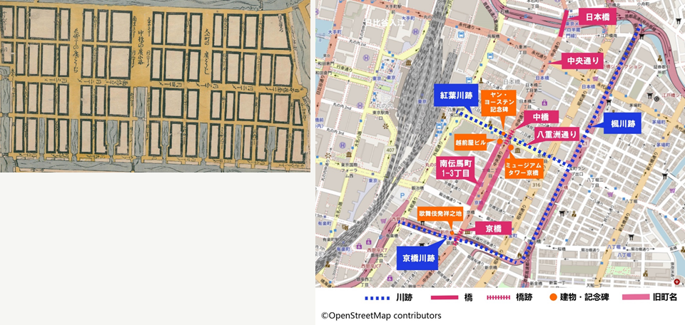 左は延宝8年(1680)刊行の『江戸方角安見圖鑑(部分)』(表紙屋市郎兵衛版)、右は現在図。『江戸方角安見圖鑑』では、紅葉川は、西側半分が埋め立てられて中橋広小路となり、東側半分が残っている。中橋広小路から左、京橋にいたるまでの通り道筋(中央通り)の両側が南伝馬町一丁目~三丁目(提供・国立国会図書館デジタルコレクション)