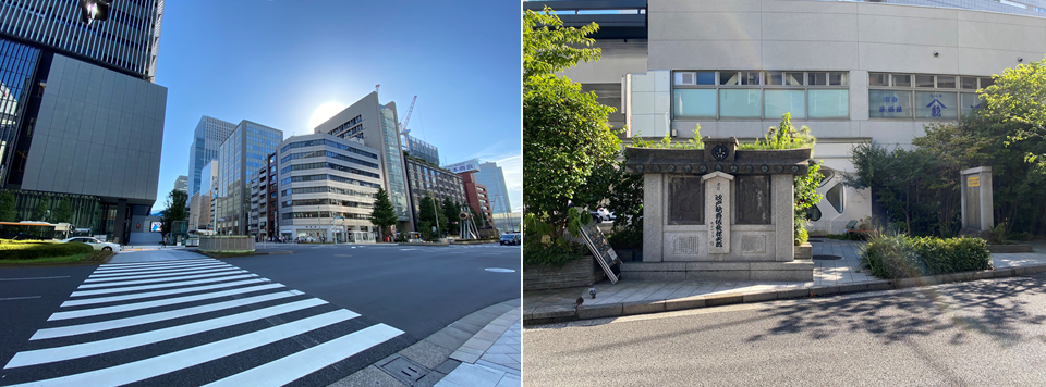 中橋があった日本橋三丁目交差点(左)。右の角が越前屋ビル、左の角がミュージアムタワー京橋。八重洲通りの中央分離帯(左写真右端)には、オランダ人ヤン・ヨーステンの記念碑がある。その名にちなむ「八重洲河岸」は丸の内側だったが、明治になってこの地が八重洲と名づけられたため、この場所に建てられたと思われる。そして本来ならばここにあるべきはずの「江戸歌舞伎発祥之地」碑(右)はスペース上の問題で京橋に建てられるという、ややこしいことに