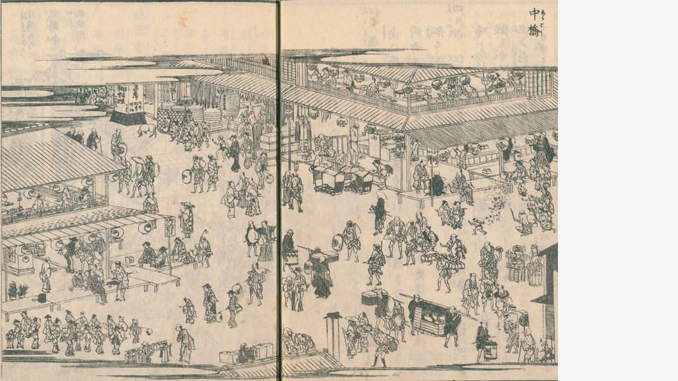 天保7年(1836)刊『江戸名所図会』(編・齋藤月岑、画・長谷川雪旦)に描かれている中橋広小路(提供・国立国会図書館デジタルコレクション)