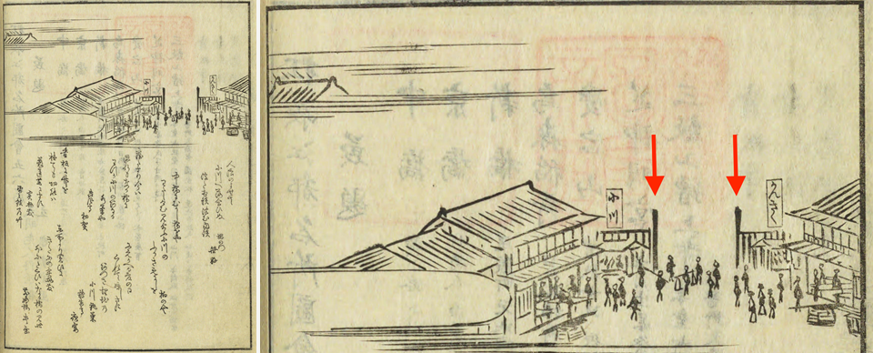 では実際、この二軒は四つ角のどこに位置していたのだろうか。『新撰東京名所図会』には〈東西の両角〉としか書いていないから、確定はできない。ただ、歌川広重が絵を描いた『狂歌江都名所図会』に、両茶屋のことが詠われていると記されていたので、そちらも参照してみる。すると、ささっとデッサンしたような挿絵が添えられてあった。だが、こちらは小川が右、環菊が左にあり、『江戸名所図会』とは位置が逆になっている。