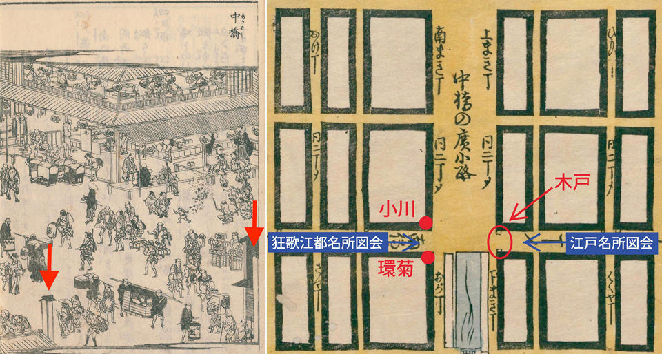 左)『江戸名所図会』の「中橋」の右頁。矢印で示した柱が木戸