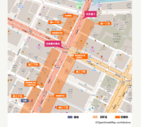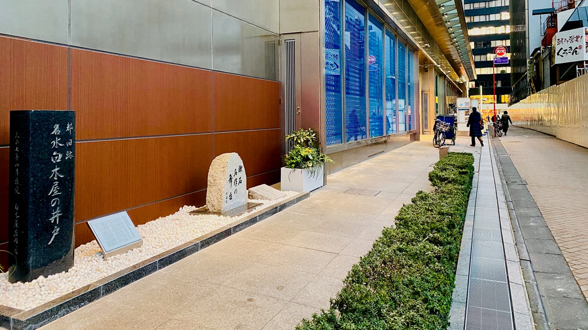 木原店があった路地から、中央通りを望む。左がコレド日本橋で、「白木屋名水の井戸」の碑(手前)と「漱石名作の舞台」の碑(奥)が移設されている。通りを挟んで反対側(日本橋寄り)は現在再開発中