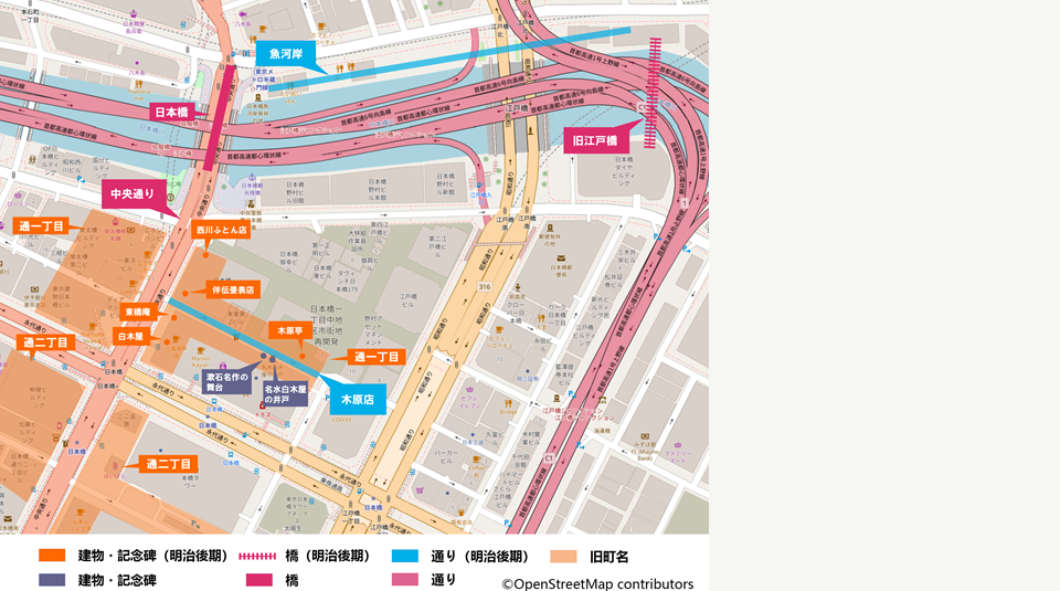 幕末から明治にかけ、飲食店が軒を連ねるようになった「木原店(きわらだな)」。木原店があったのは日本橋のすぐ近く、中央通り沿いから東に折れるコレド日本橋の北側に位置する路地だ。再開発が進むいまは、歴史を伝える「漱石名作の舞台」の碑と「白木屋名水の井戸」の碑(前篇参照)が建つぐらいで人通りもまばらだが、昔ならば通一丁目の白木屋側の路地、と言えば通じた繁華なエリアだった。